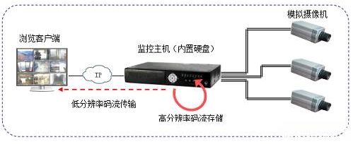 有些廠家的網(wǎng)絡(luò)視頻前端可以編出不同分辨率的兩路碼流,分辨率較大的碼流用作錄像存儲,分辨率較小的碼流用作實時瀏覽。這樣可以充分降低遠程瀏覽所占的網(wǎng)絡(luò)帶寬的壓力,但用法不夠靈活,用戶在帶寬充裕的情況下也只能瀏覽低分辨率的圖像。如下圖: